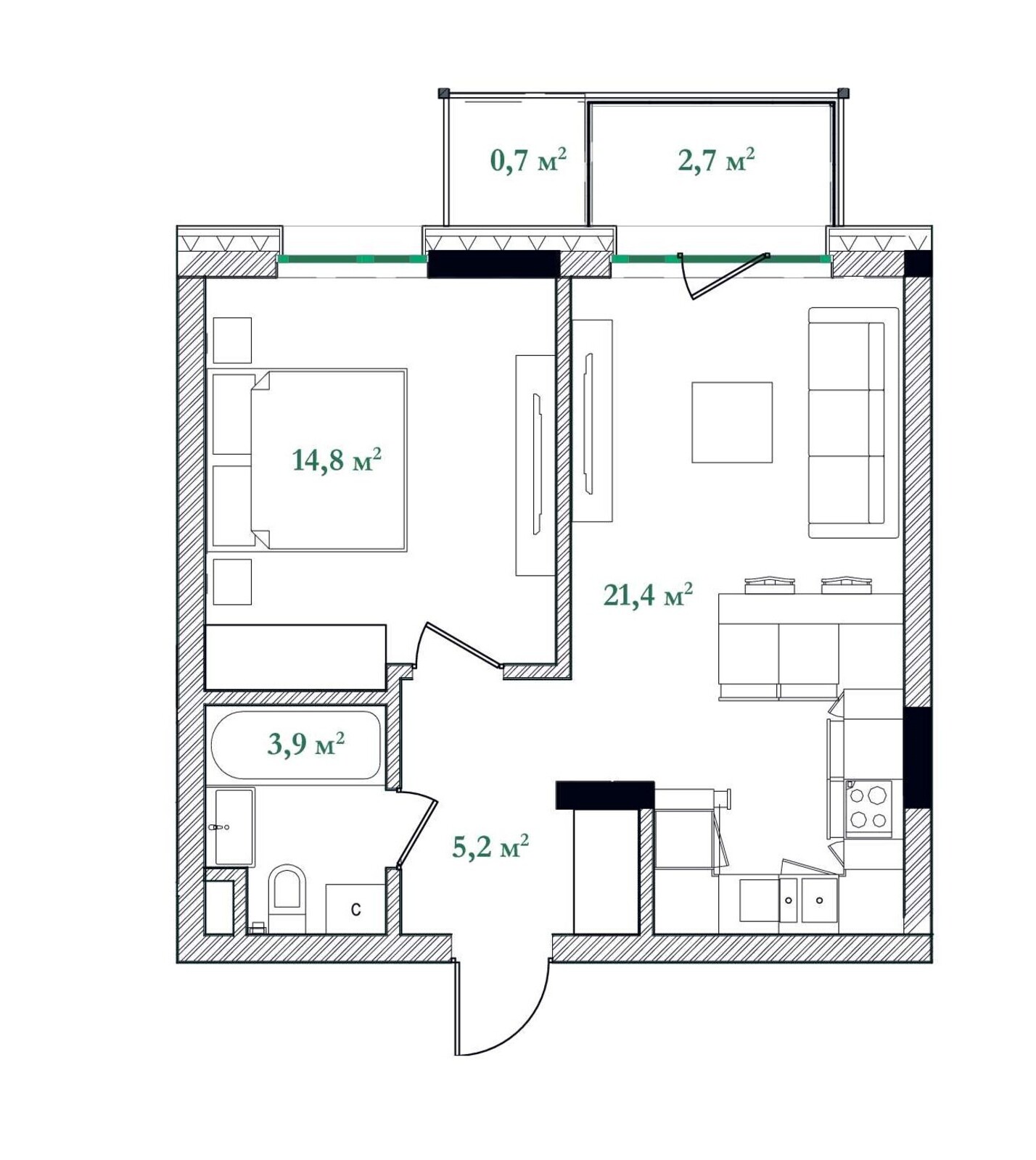 Чудове планування: велика кухня-вітальня 21,4м, окрема спальня, є балкон, с/в сумісний.