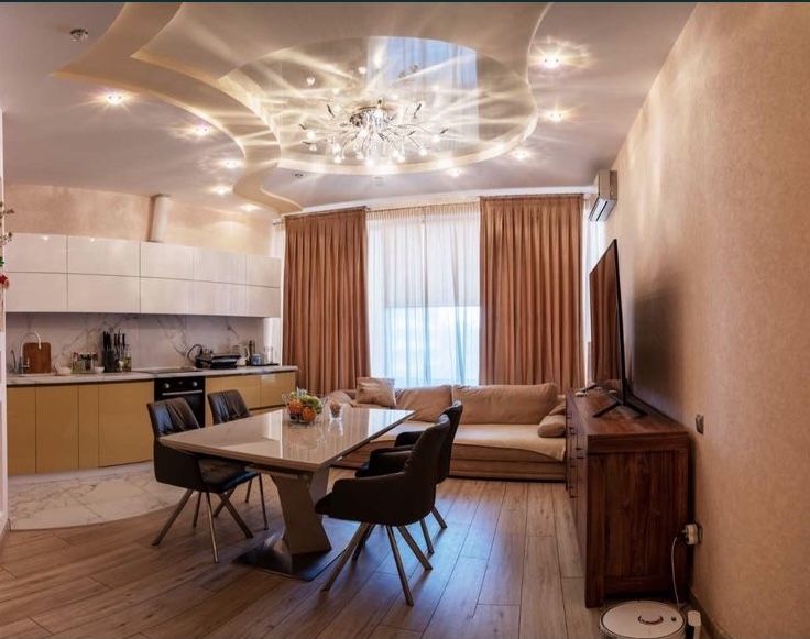 Две раздельные спальни, просторная кухня-гостиная. Квартира с ремонтом. Встроенная кухня с доводчиками фирмы "BLUM", есть вся бытовая техника.Сигнализация фирмы Аякс. Плюсы этого дома - паркинг, есть всегда свободные места в неограниченном количестве, а также бассейн, баня и спорт. зал, салон красоты не выходя из дома, все это находится в комплексе! Так же свой выход в парк Юность с шикарным видом моря и детскими площадками.