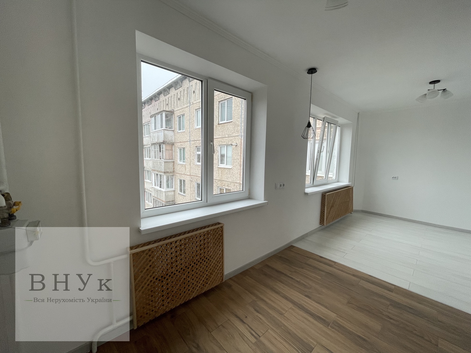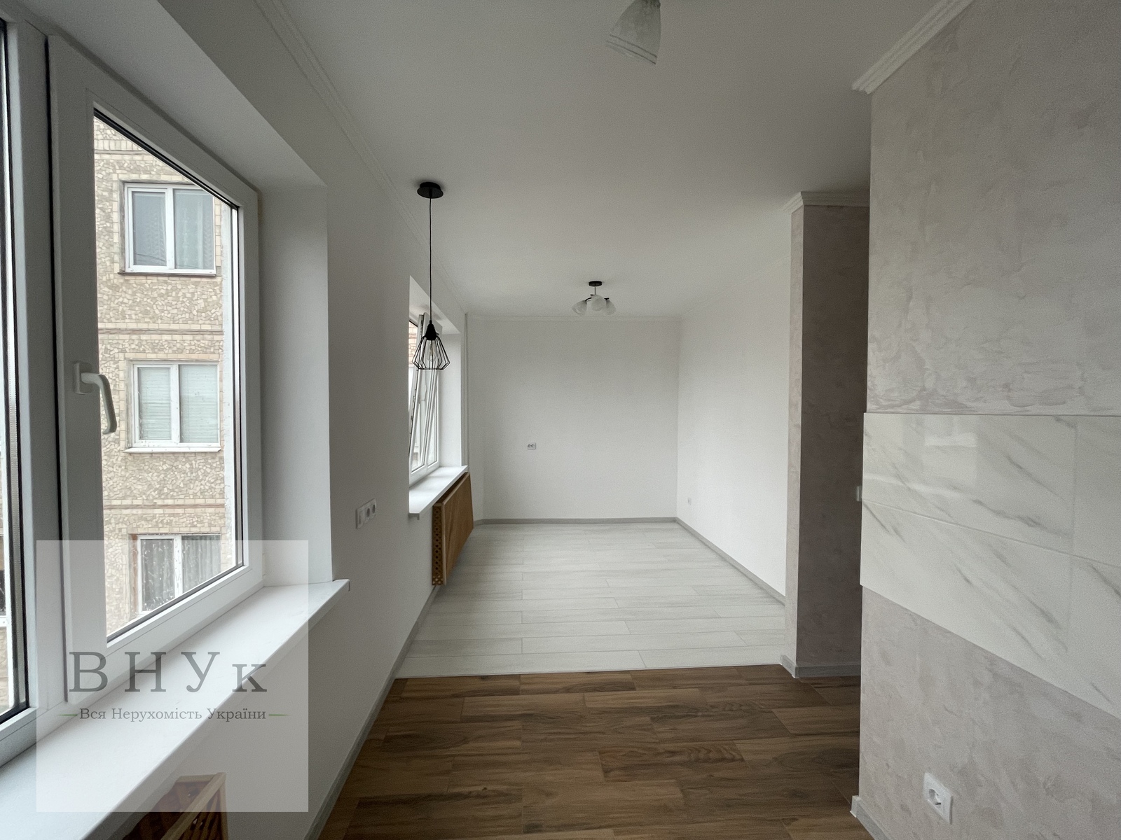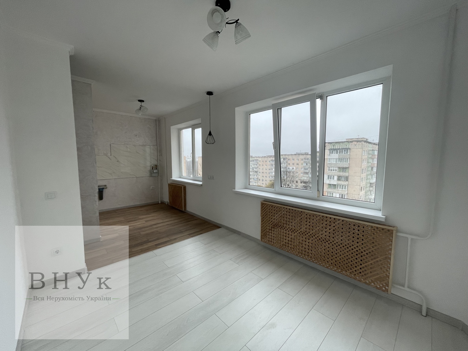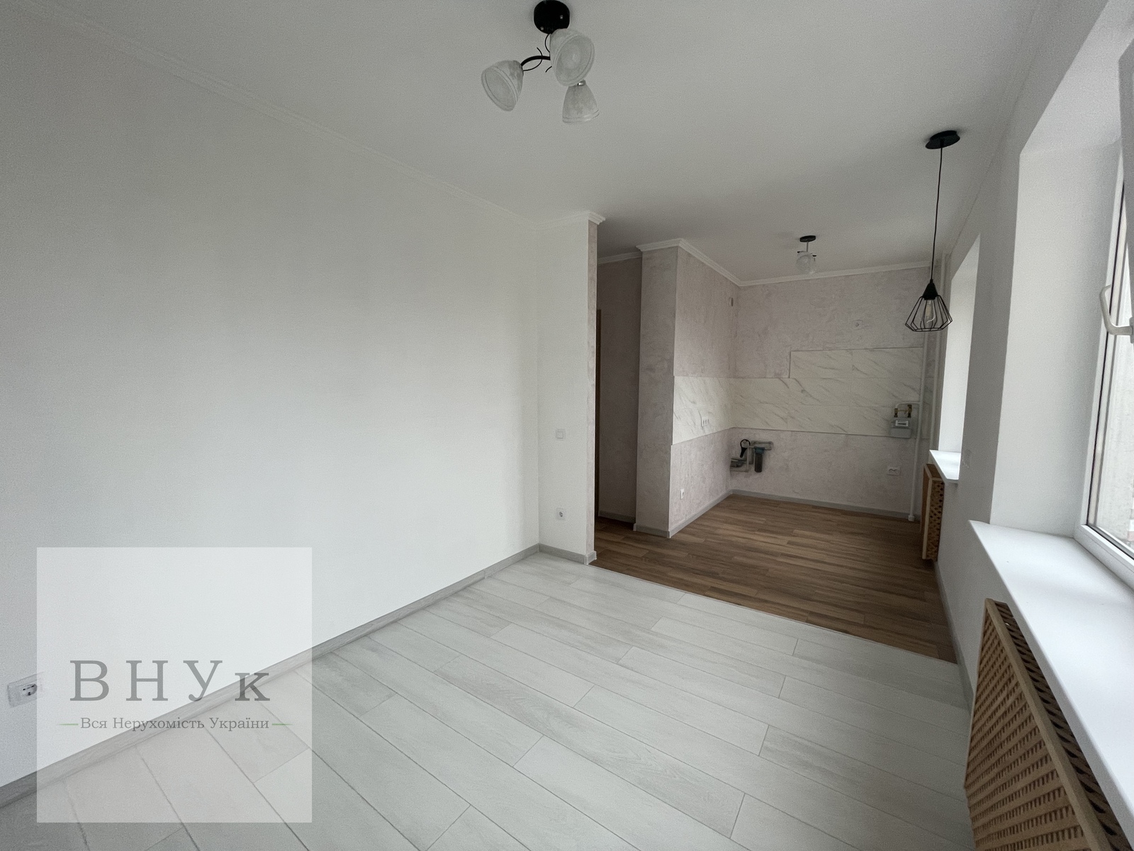 Сучасна кухня-студія чудово поєднана з вітальнею. Два великих пластикових вікна надають відчуття простору та відкривають гарну панораму в двір. Окремої уваги заслуховує освітлення: кожна зона освітлюється окремо, виділене місце для барної стійки або для кавомашинки. Готовий кухонний фартух.