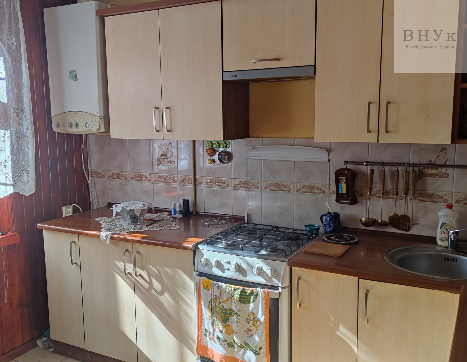 Загальна площа 55 кв. м, кухня 9 кв.м, кімнати 16 і 12 кв. м., прибудова 10 кв. м. Квартира продається з меблями, холодильником та пральною машиною.