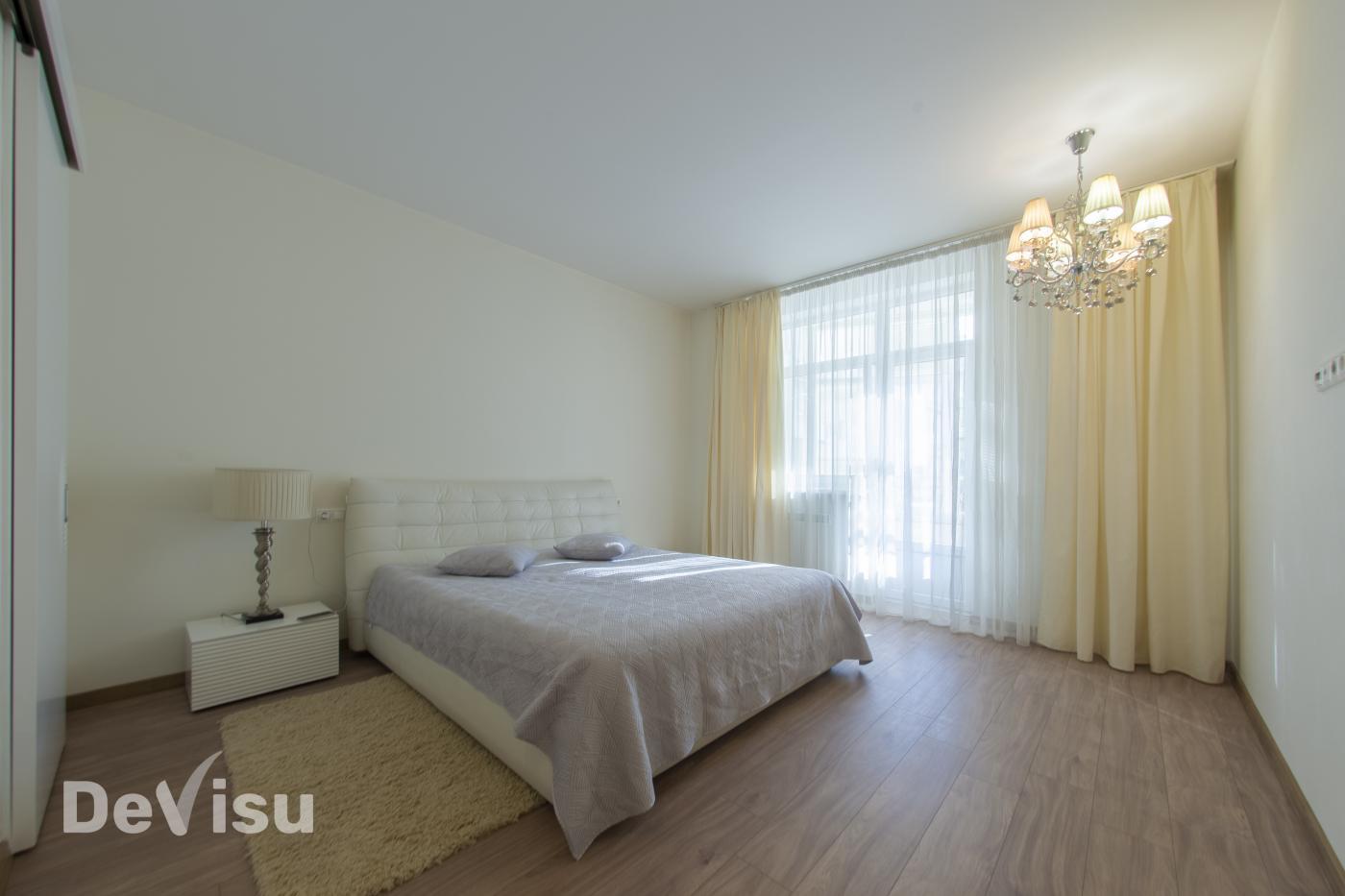 Дві спальні (майстер спальня та дитяча), три гардероби (два у спальнях), два санвузли (один у мастер-спальні), балкон та кухня-кухня.