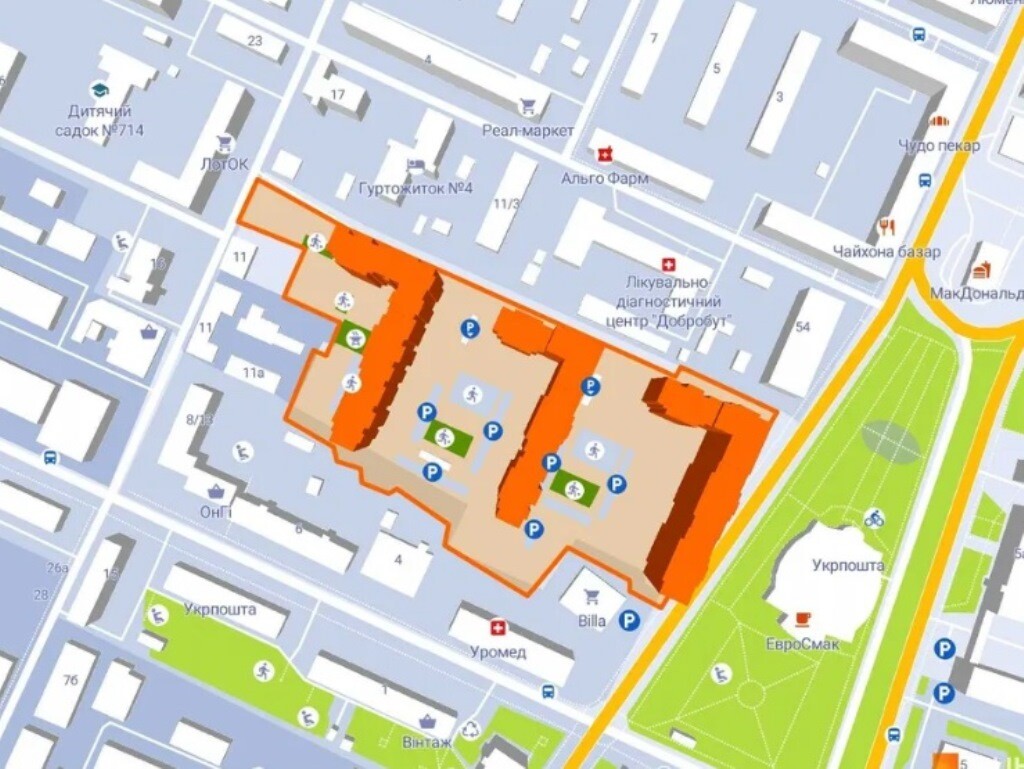 Внутренняя закрытая территория без автомобилей.