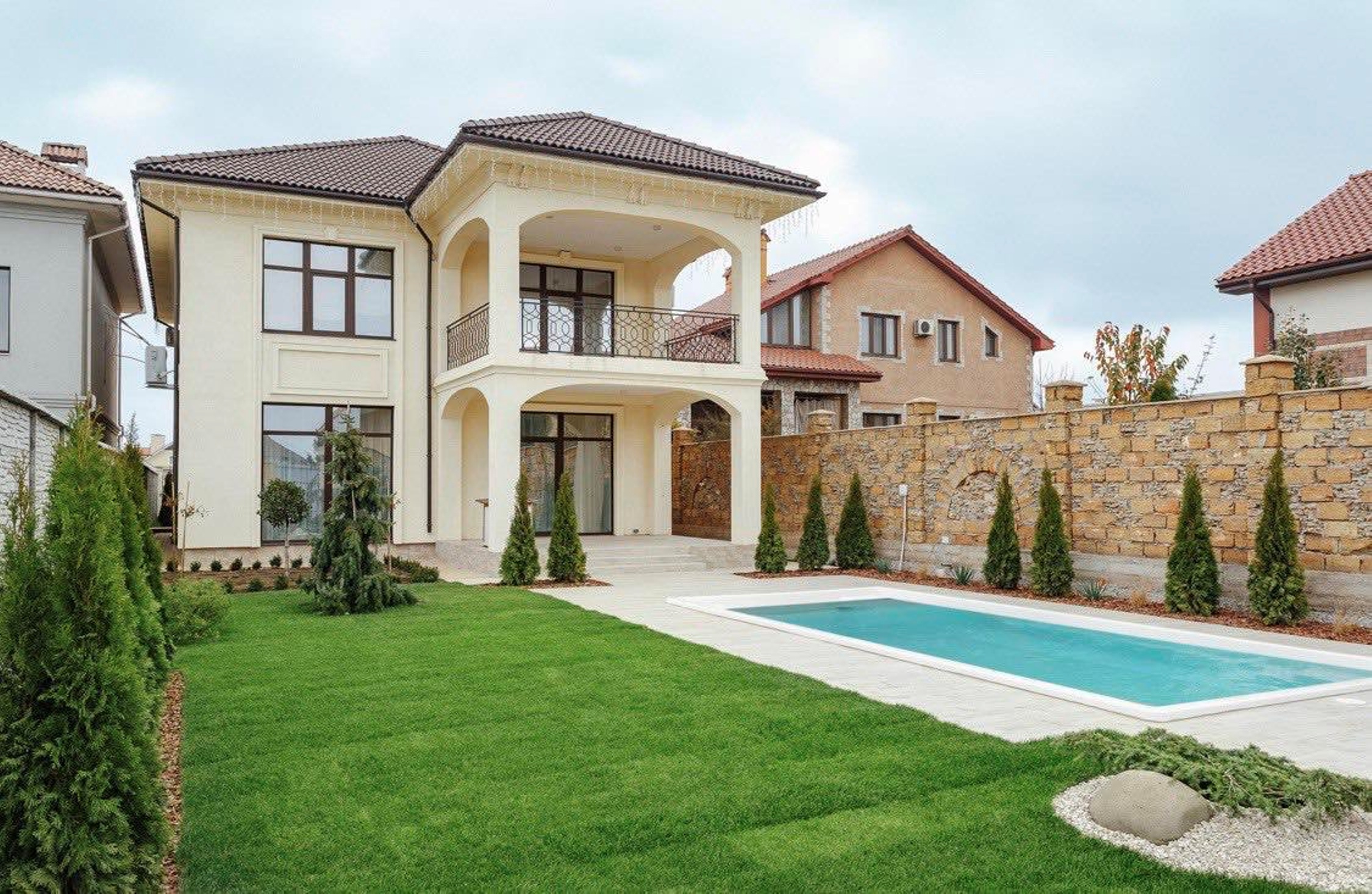 №2669. . . Предлагаем к продаже 2-х этажный новый дом в элитном коттеджном поселке, закрытого типа, в Совиньоне на ул. Береговая. Общая площадь 248 кв.м. Распланирован на 3 спальни, кабинет, гостиная, кухня, три сан узла и 2 гардеробные. Выполнен стильный ремонт из качественных дорогостоящих материалов по дизайнерскому проекту в стиле "неоклассика". Лестница - итальянский мрамор. Система "теплый пол". Есть 2 террасы, из которых открывается шикарный вид на море. Укомплектована мебелью, итальянского производства. Дом построен из красного кирпича. Кровля натуральная черепица. В доме предусмотрен гараж. Располагается на участке, площадью 7 соток. Есть гос акт. Оборудован бассейн, длиной 8 м. Во дворе ландшафтный дизайн. 40 м спуск к морю и лучшим пляжам. Хорошо развитый район.